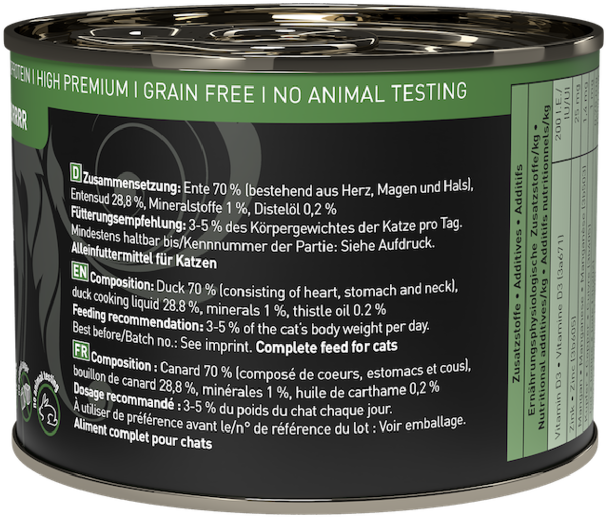 70 % Duck (Heart, Stomach, Neck), 28,8 % Duck broth, 1 % Minerals, 0,2 % Safflower oil