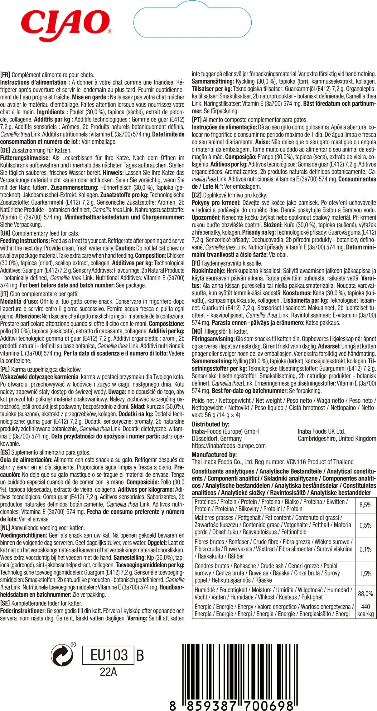 30 % Chicken, Tapioca, Scallop extract, Collagen, Green tea extract