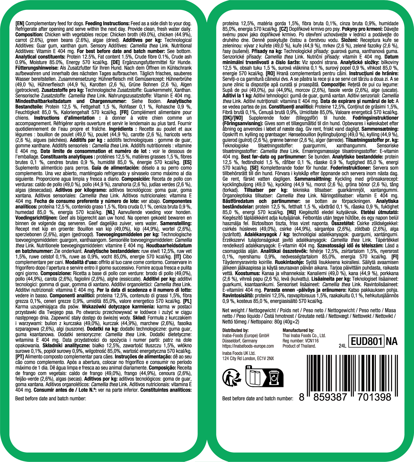 49 % Chicken broth, 44,9 % Chicken, 2,6 % Carrot flakes, 2,6 % Green beans, Dried algae, Guar gum, Xanthan gum
