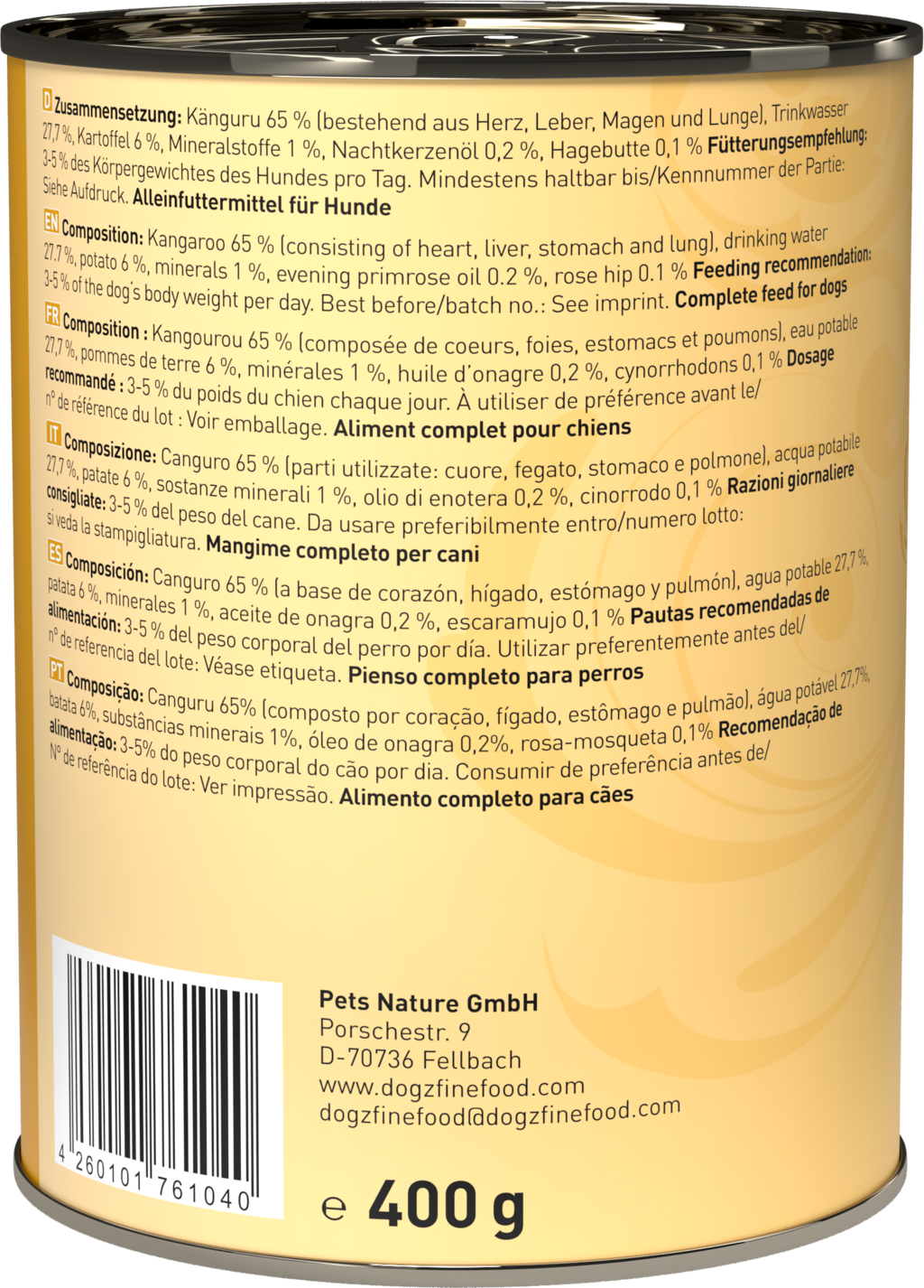65 % Kangaroo (Heart, Liver, Stomach, Lung), 27,7 % Water, 6 % Potatoes, 1 % Minerals, 0,2 % Evening primrose oil, 0,1 % Rosehips