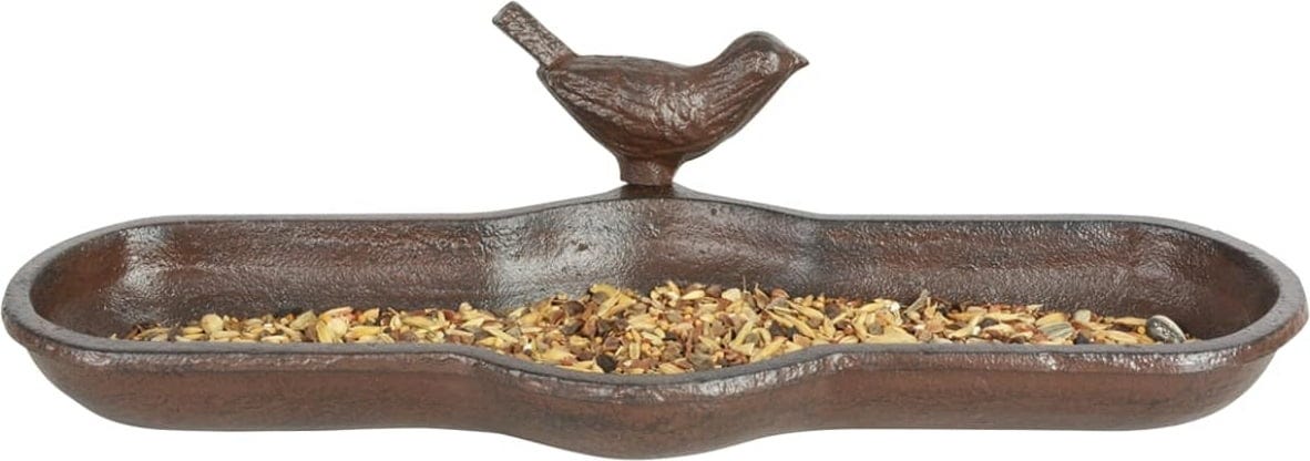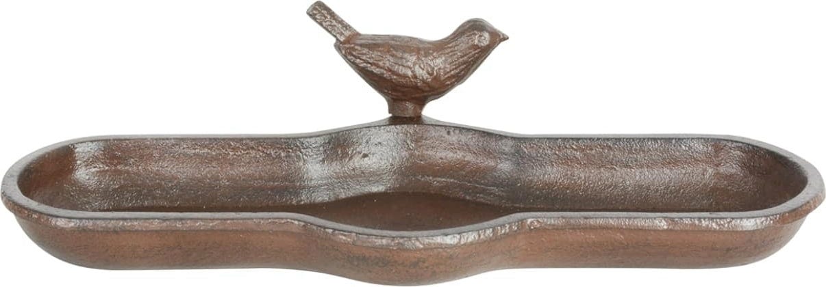This bird bath is a charming garden accessory and offers birds a place to quench their thirst or have a bath. Made of sturdy cast iron, the birdbath can also be used as a feeder. One bird is already perched on the edge of the feeder, encouraging other birds to do the same!