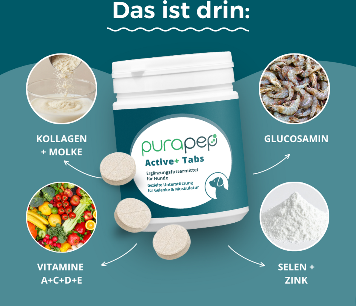 - purapep Active+ Tabs contain poultry proteins from poultry liver (chicken and turkey). If your dog is allergic to these ingredients, do not feed purapep Comfort.